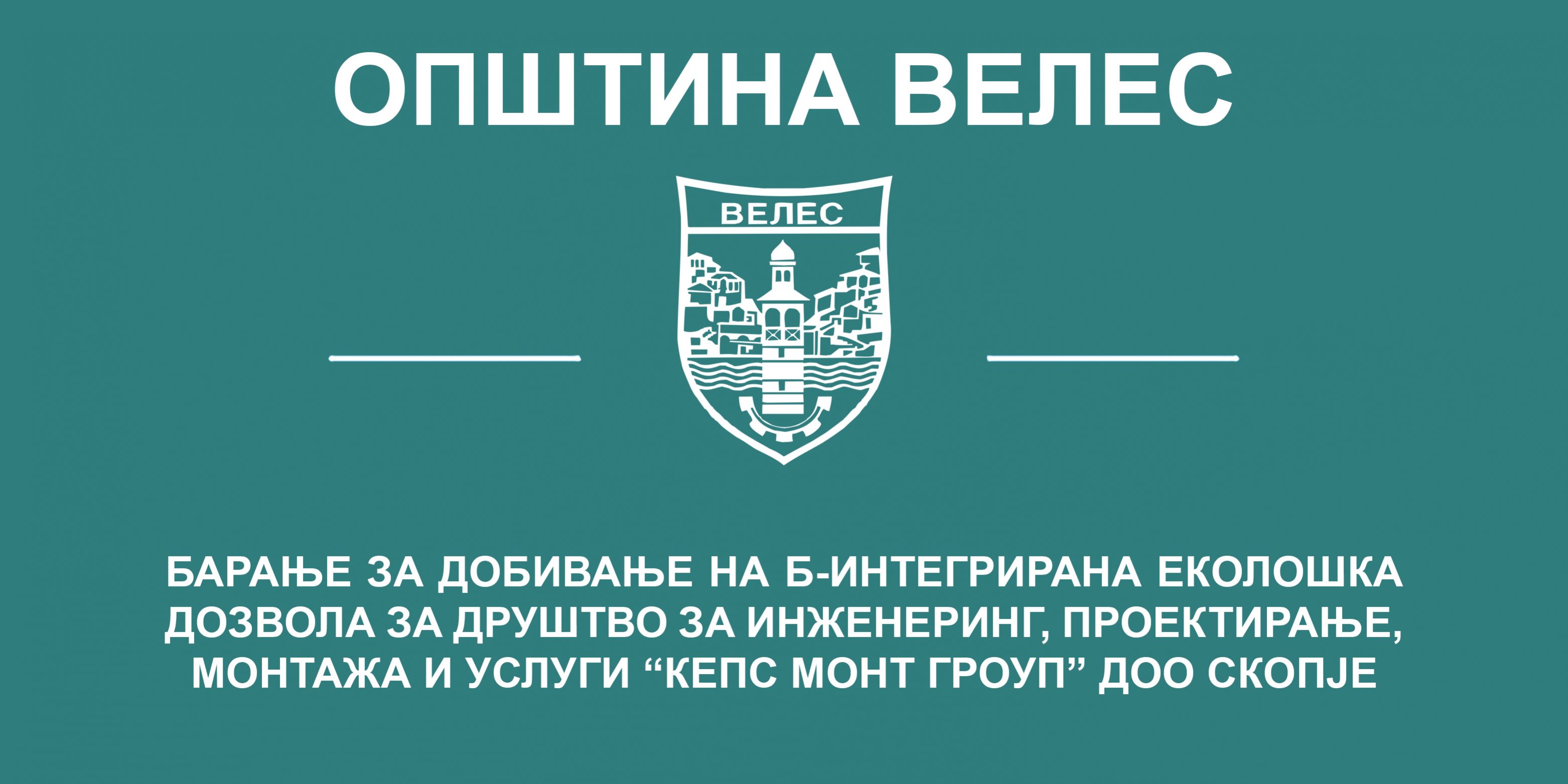 Согласно член 122 став 4, а во врска со член 99 став 1 од Законот за животната средина (Службен весник на РМ бр. 53/05, 81/05, 24/07,159/08, 83/09, 48/10,124/10, 51/11, 123/12, 93/13, 187/13, 42/14, 44/15, 129/15, 192/15, 39/16, 99/18), до Градоначалникот на Општина Велес доставено е Барање за добивање на Б-Интегрирана еколошка дозвола со бр.23-2471/3 од 13.08.2019 г.