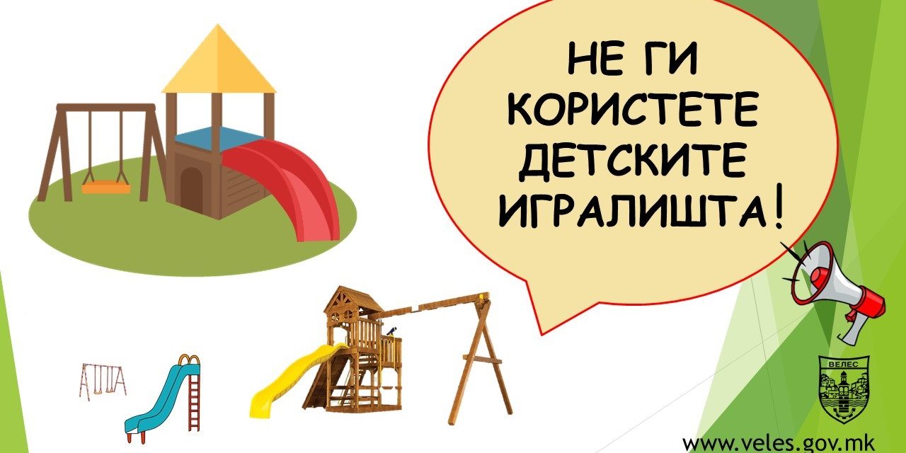 Како дел од мерките за заштита и превенција од ширење на Covid – 19 (коронавирус), Општина Велес ја известува јавноста дека ги затвора сите детски игралишта, оградувајќи ги со заштитна лента спортските терени, патеката околу езеро „Младост” и другите јавни површини во градот со цел редуцирање на движењето на граѓаните.