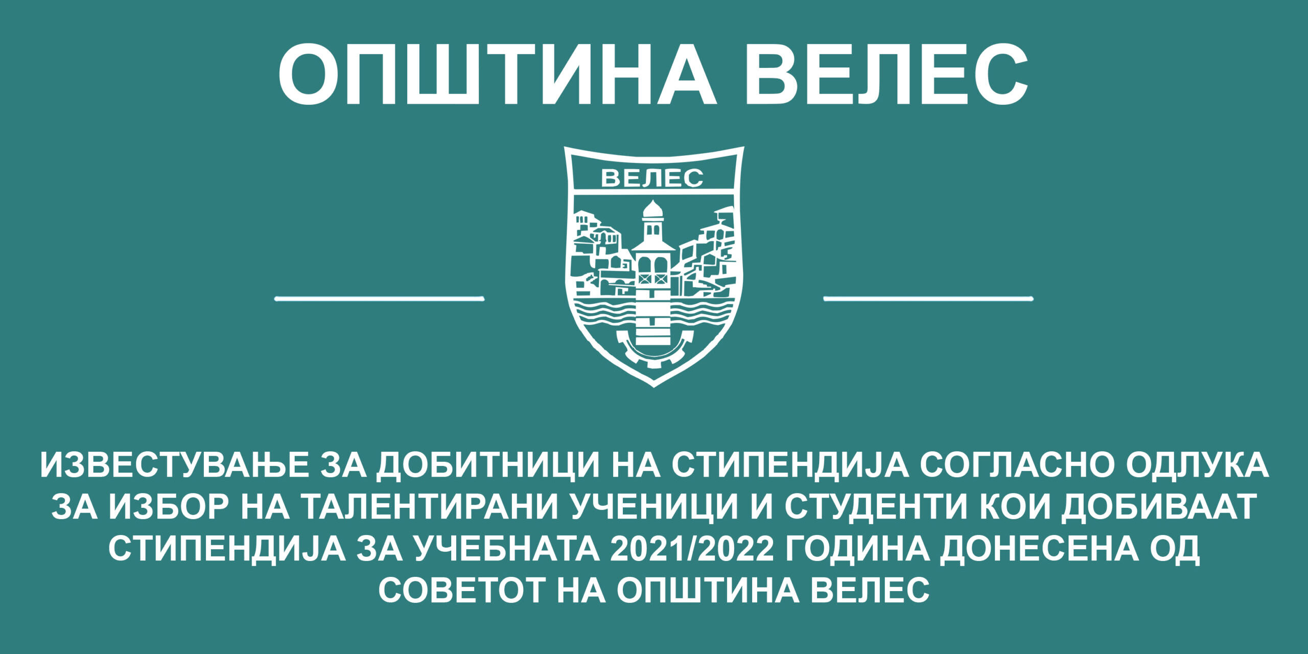 • Известување за добитници на стипендија согласно Одлука за избор на талентирани ученици и студенти кои добиваат стипендија за учебната 2021/2022 година донесена од Советот на Општина Велес