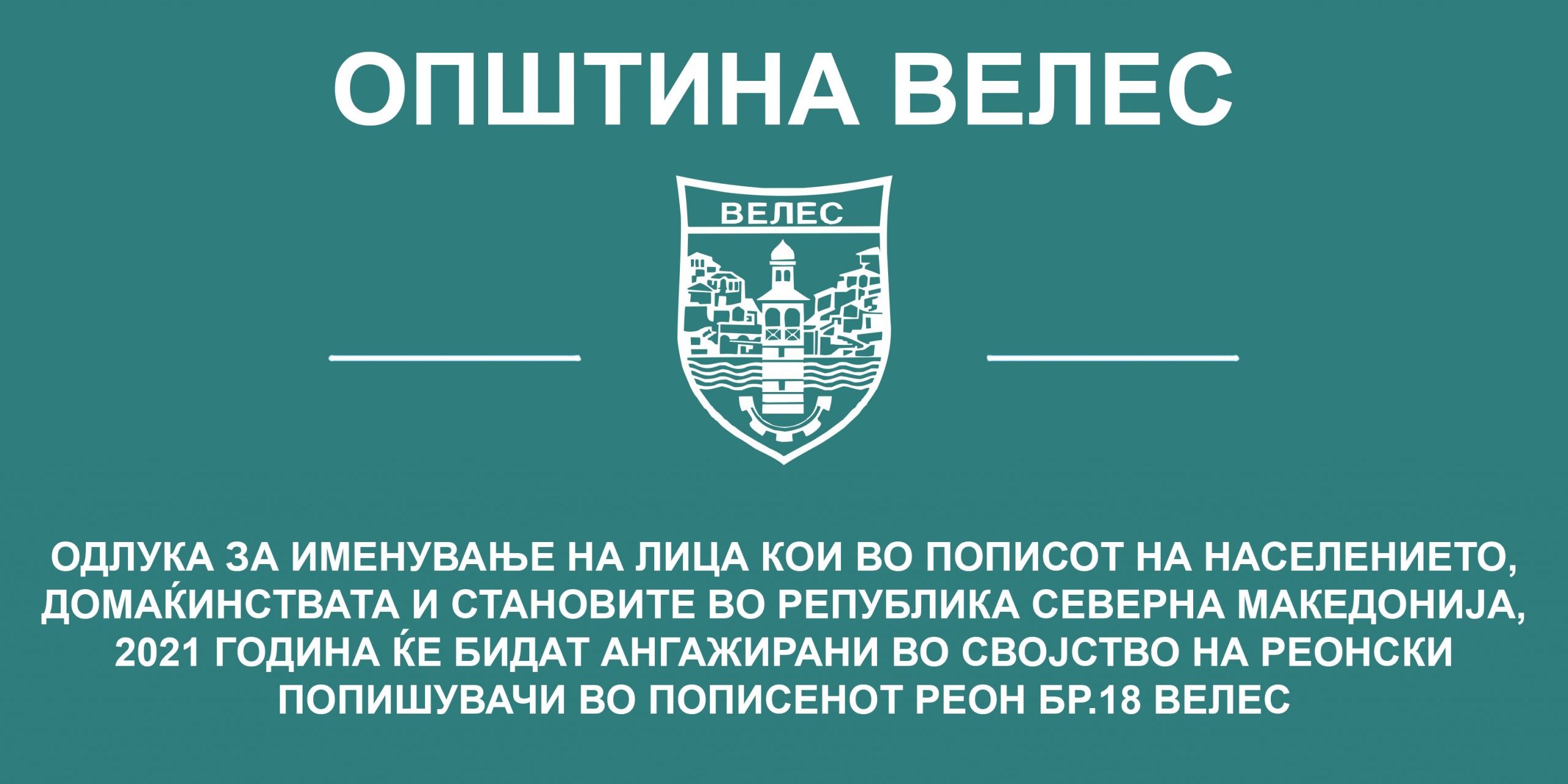 Одлука за именување на лица кои во Пописот на населението, домаќинствата и становите во Република Северна Македонија, 2021 година ќе бидат ангажирани во својство на Реонски попишувачи во Пописенот реон бр.18 Велес