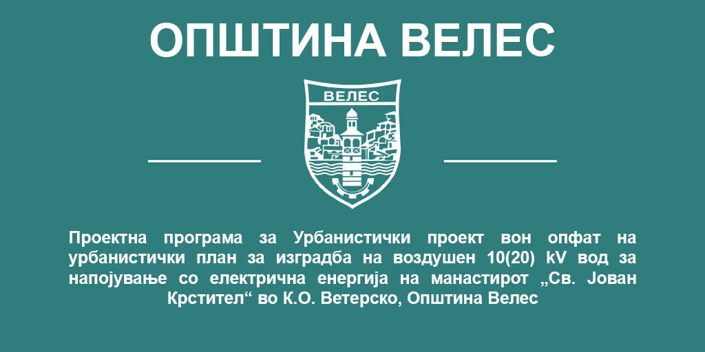 Проектна програма за Урбанистички проект вон опфат на урбанистички план за изградба на воздушен 10(20) kV вод за напојување со електрична енергија на манастирот „Св. Јован Крстител“ во К.О. Ветерско, Општина Велес