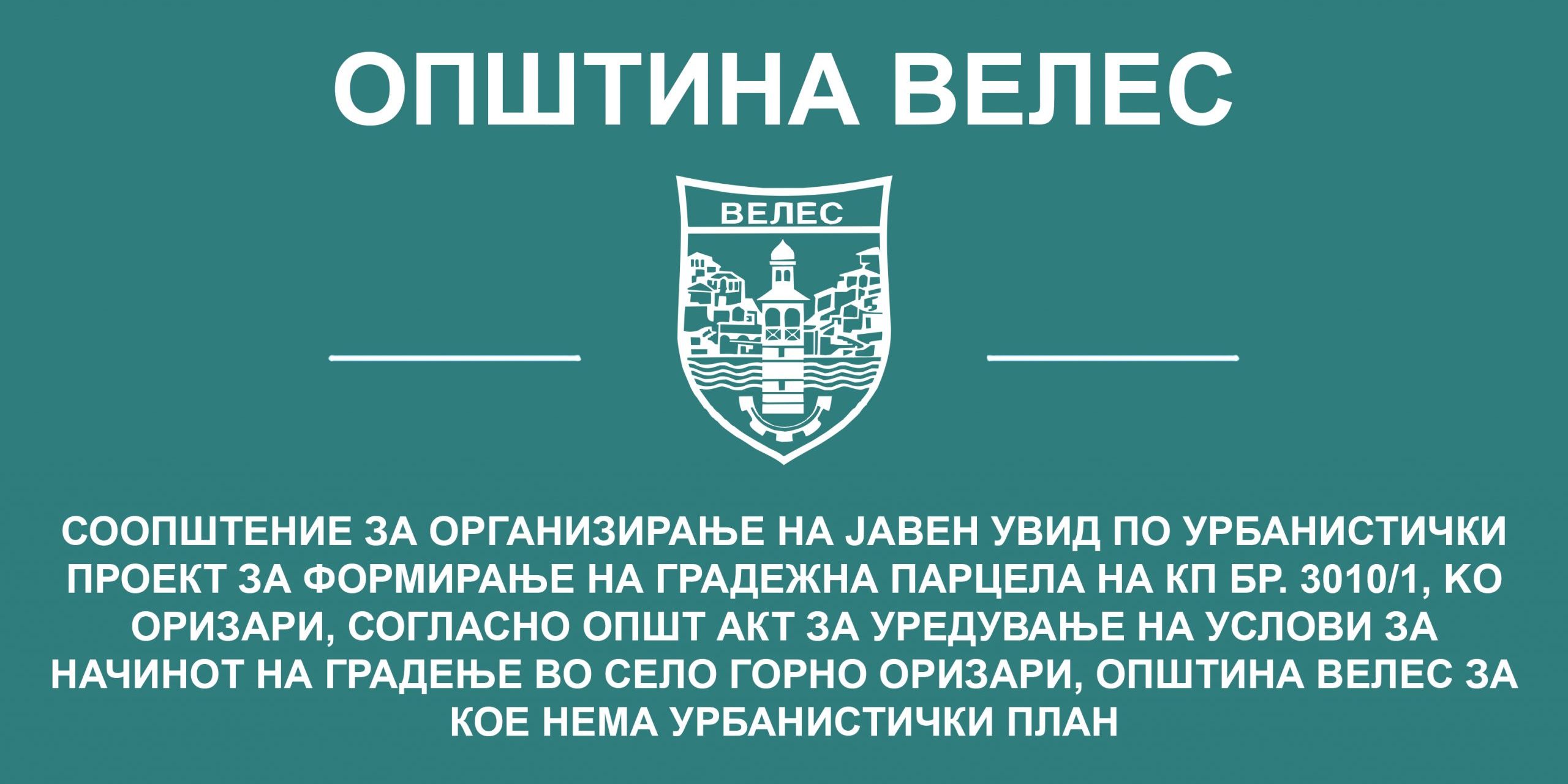 Јавниот увид по Урбанистички проект за формирање на градежна парцела на КП бр. 3010/1, KO Оризари, согласно Општ акт за уредување на услови за начинот на градење во село Горно Оризари, Општина Велес за кое нема урбанистички план (Одлука бр. 27-1080/7 од 13.02.2015 година), ќе се спроведе со објавување на службената веб страна на Општина Велес.