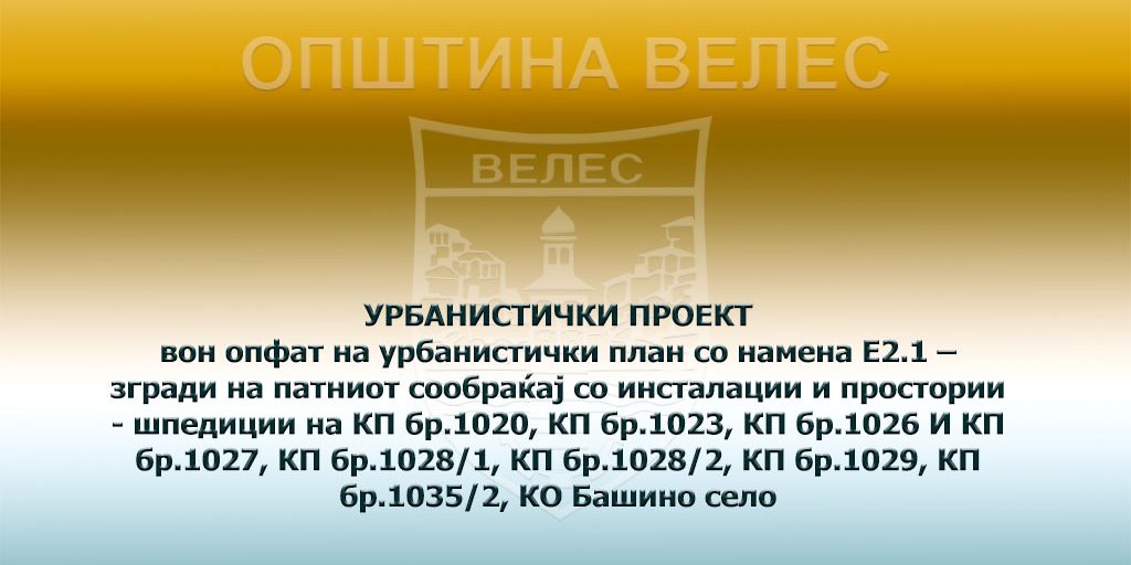 УРБАНИСТИЧКИ ПРОЕКТ вон опфат на урбанистички план со намена E2.1 – згради на патниот сообраќај со инсталации и простории – шпедиции на КП бр.1020, КП бр.1023, КП бр.1026 И КП бр.1027, КП бр.1028/1, КП бр.1028/2, КП бр.1029, КП бр.1035/2, КО Башино село