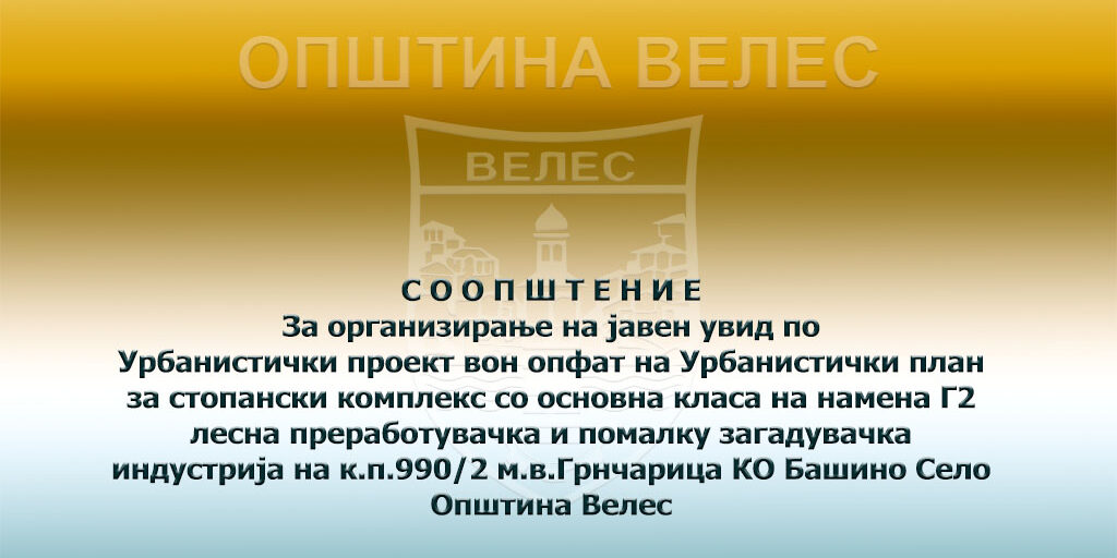 Јавниот увид за Урбанистички проект вон опфат на Урбанистички план за стопански комплекс со основна класа на намена Г2 лесна преработувачка и помалку загадувачка индустрија на к.п.990/2 м.в.Грнчарица КО Башино Село Општина Велес.