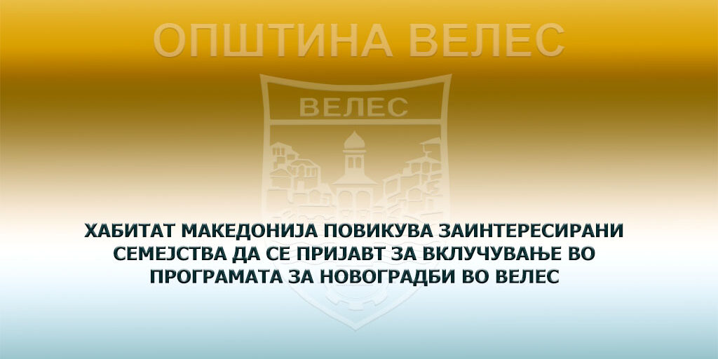 Оваа покана се однесува на избор на 12 семејства. Програмата има на располагање 12 нови станови со површина од 45,70 до 68 м2 во нов, целосно изграден објект во населбата Хабитат во Велес, со адреса на ул. Невена Георгиева Дуња бр. 8А.