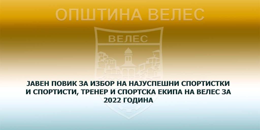 1. „Сојузот на спортови на Велес“ покренува постапка за „Избор на најуспешни спортистки и спортисти, тренер и спортска екипа на Град Велес, за 2022 година“.