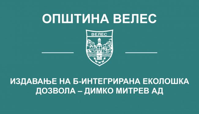 Градоначалникот на Општина Велес ОБЈАВУВА Издавање на Б-Интегрирана еколошка дозвола Согласно член 113, став 1 и член 122, став 4 од Законот за животната средина (“Службен весник на РМ” бр. 53/05, 81/05, 24/07, 159/08, 83/09, 48/10, 124/10, 51/11, 123/12, 93/13, 187/13, 42/14, 129/15, 192/15, 39/16, 99/18), Градоначалникот на Општина Велес издаде Б – Интегрирана еколошка…