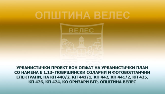 Урбанистички проект вон опфат на урбанистички план со Намена Е 1.13- Површински соларни и фотоволтаични електрани, на КП 440/2, КП 441/1, КП 442, КП 441/2, КП 425, КП 426, КП 424, КО Оризари вгр, Општина Велес