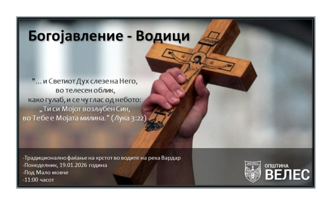 Во пресрет на големиот христијански празник Богојавление Водици, Општина Велес ги повикува сите заинтересирани православни христијани кои сакаат да учествуваат на традиционалното фаќање на светиот крст од водите на река Вардар, да се пријават во просториите на Повардарската епархија денеска до 16:00 часот. Чинот на фрлање на светиот крст ќе се одржи во понеделник, 19…