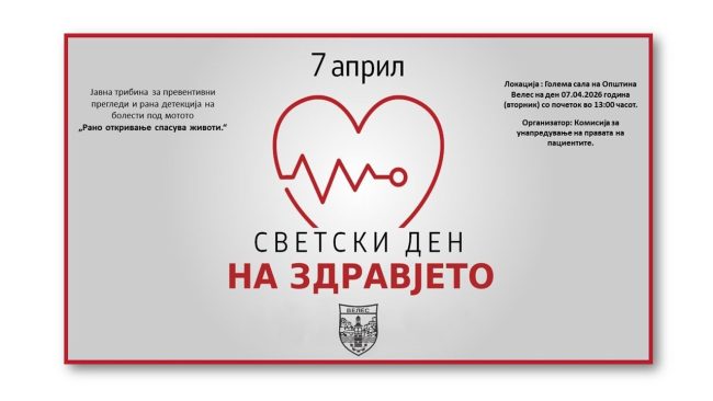 Комисијата за унапредување на правата на пациентите на Општина Велес, по повод одбележувањето на „Светскиот ден на здравјето“ 7-ми Април, организира Јавна трибина за превентивни прегледи и рана детекција на болести под мотото „Рано откривање спасува животи“. Јавната трибина е посветена на подигање на свеста за значењето на превентивните прегледи и раната детекција на болести.…