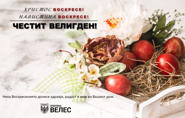 По повод големиот христијански празник Велигден, Општина Велес упатува искрени честитки со желби за добро здравје, мир и благосостојба. Нека светлината на Христовото Воскресение ги исполни вашите домови со љубов, радост и духовна сила и нека ви донесе надеж и успех во сите животни предизвици. Христос Воскресе!