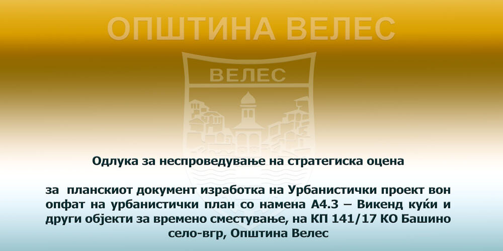 За планскиот документ изработка на Урбанистички проект вон опфат на урбанистички план со намена А4.3 – Викенд куќи и други објекти за времено сместување, на КП 141/17 КО Башино село-вгр, Општина Велес.