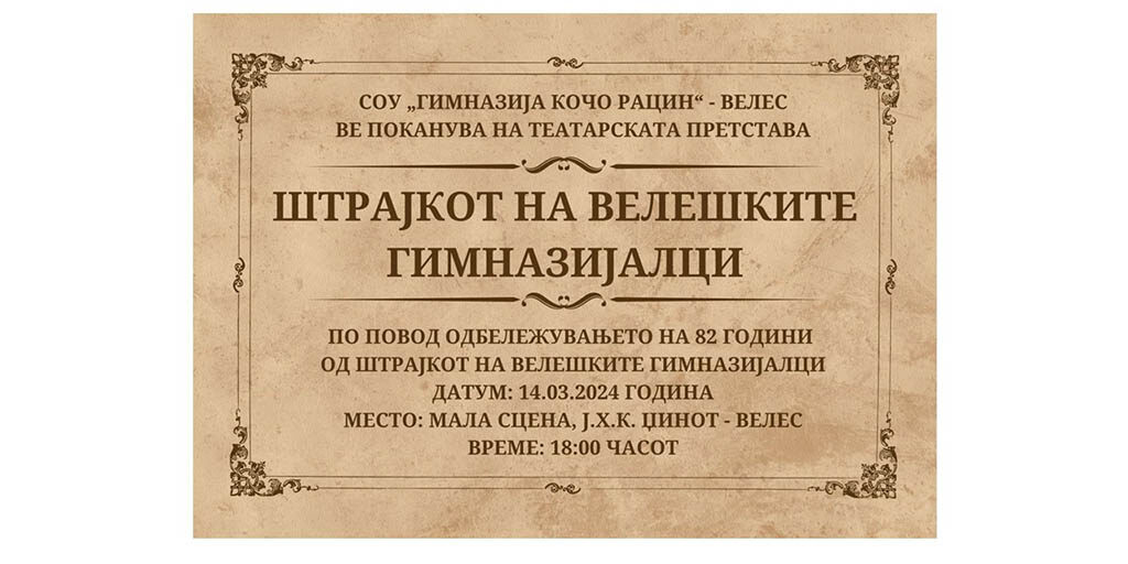 По повод годишнината, Гимназијата Кочо Рацин вечерва ќе одржи театарска претстава „Штрајкот на велешките гимназијалци“ на малата сцена на театарот Ј.Х.К.Џинот, со почеток во 18:00 часот.
