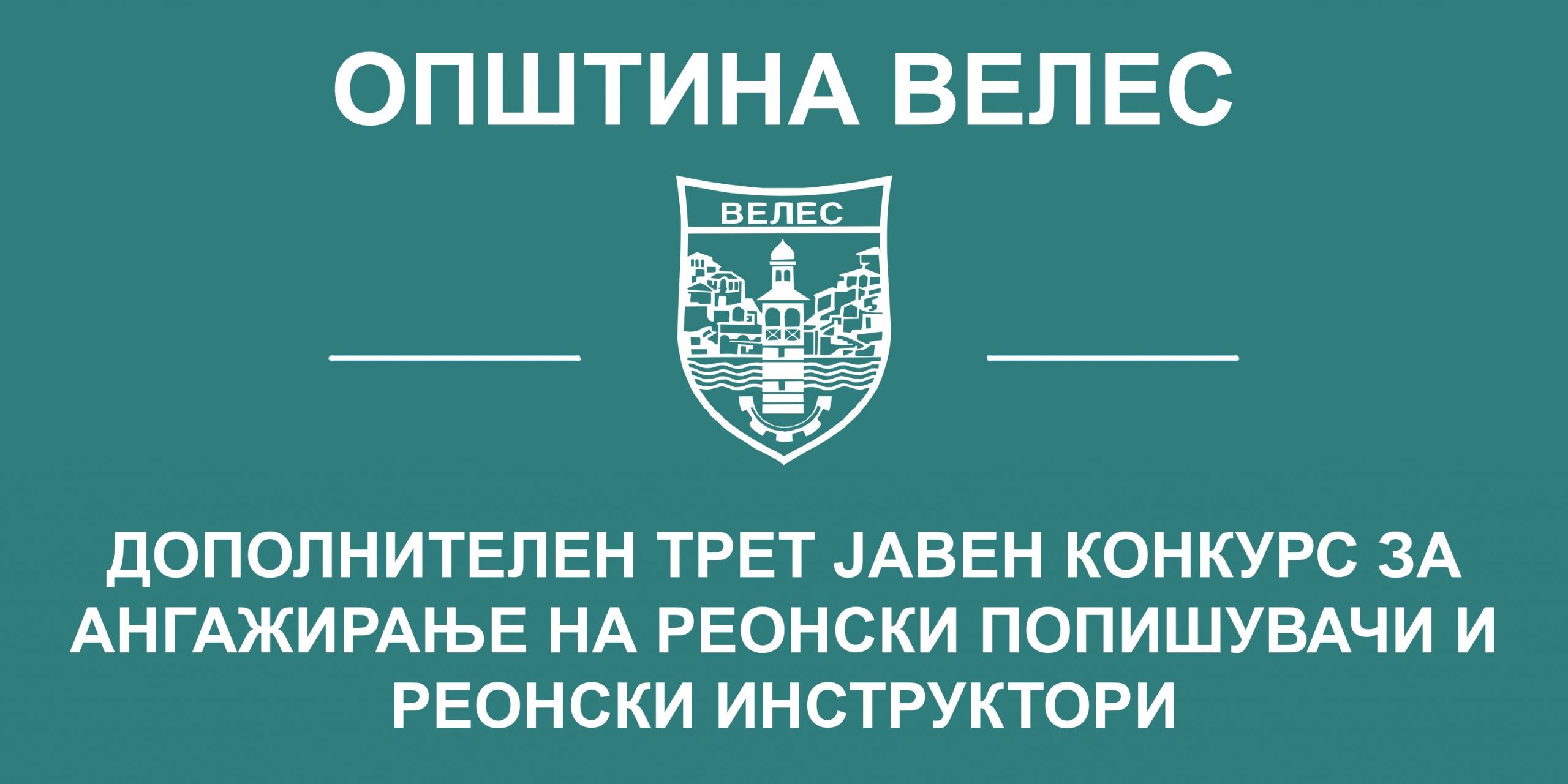 Општина Велес ги повикува сите заинтересирани граѓанки и граѓани да бидат дел од пописот на населението што ќе се реализира од 01 до 21 април годинава, да се јават на огласот за попишувачи што е објавен на официјалната веб страница на Општина Велес и на огласните табли во седиштето на пописната комисија. Огласот е објавен денеска и ќе трае до 22 март.