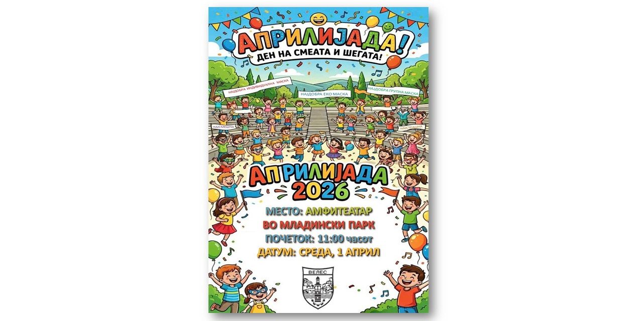 Општина Велес и годинава организира настан за одбележување на Денот на шегата, 1 Април. На манифестацијата централно место ќе заземат децата од градинките и учениците од основните училишта кои со своите креативни маски ќе продефилираат низ улиците во градот и ќе направат весела атмосфера.