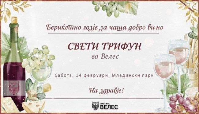 Заедничко чествување на Свети Трифун во Младински парк. Општина Велес организира пригодна програма за одбележување на празникот, заштитникот на лозјата и виното, со одлична музика, вкусна храна и квалитетни вина. Програмата ќе започне со фолклорниот ансамбл „Вила Зора“. Потоа следуваат настапите на детскиот хор „Св.Кирил и Методиј“, Ансамбл Керамичар, „Велешка чалгија“, КУД „Коле Неделковски“, „Стакато…