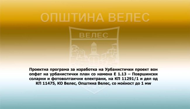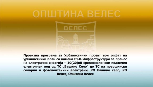 : Проектна програма за Урбанистички проект вон опфат на урбанистички план со намена Е1.8-Инфраструктури за пренос на електрична енергија – 10(20)кВ среднонапонски подземен електричен вод од ТС „Башино Село“ до ТС на површински соларни и фотоволтаични електрани, КО Башино село, КО Велес, Општина Велес