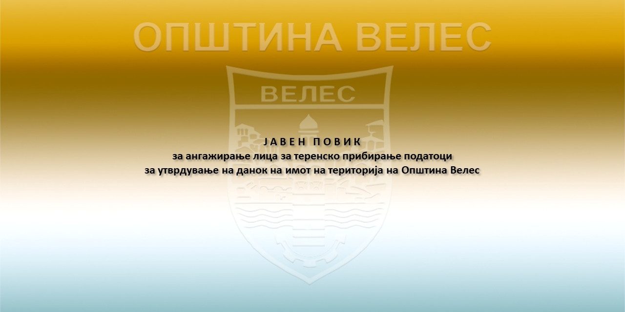 Врз основа на Одлуката за утврдување потреба од спроведување проект за ангажирање на лица за теренско прибирање податоци за утврдување на данок на имот за физички и правни лица на територија на Општина Велес број 09-1014/10 од 18.02.2026 година, донесена од Советот на Општина Велес, Градоначалникот на Општина Велес објавува Јавен повик за ангажирање на најмногу 10 лица.