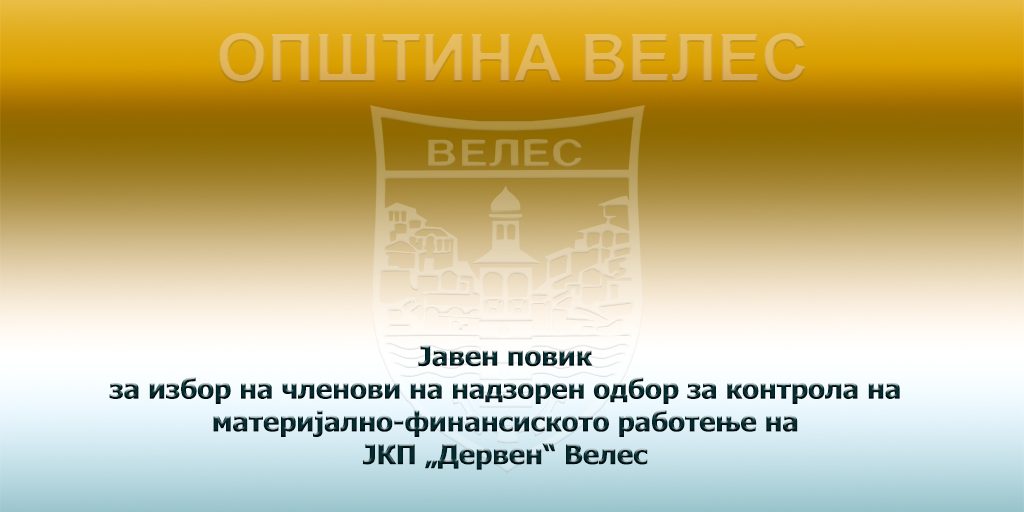Предмет на Јавниот повик е спроведување на постапка за избор на два члена члена на надзорен одбор за контрола на материјално-финансиското работење на ЈКП „Дервен“ Велес.