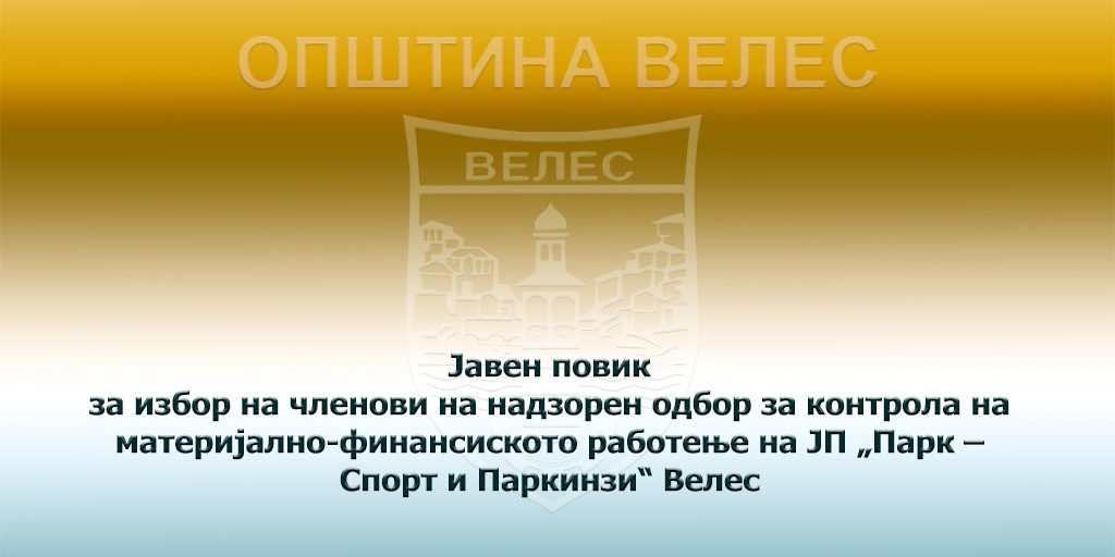 Предмет на Јавниот повик е спроведување на постапка за избор на два члена на надзорен одбор за контрола на материјално-финансиското работење на ЈП „Парк – Спорт и Паркинзи“ Велес.