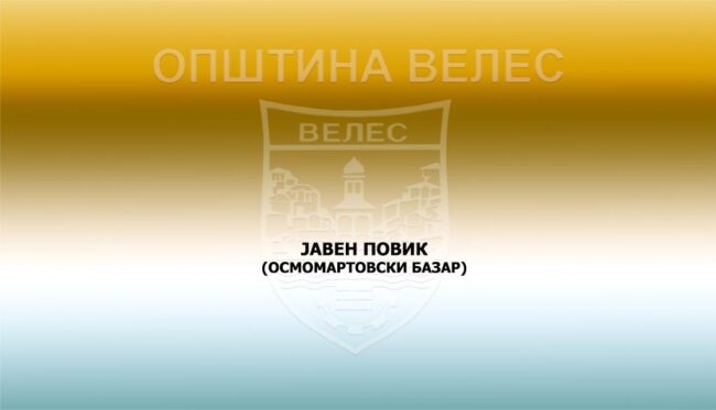 Општина Велес ќе организира Базар по повод 8 Март, Меѓународен ден на жената. По тој повод се повикуваат сите заинтересирани граѓани, правни и физички лица, да поднесат барање за тезга во Граѓански сервис центар. Во барањето треба да наведат на која од двете локации, Младински парк и плато пред Основен суд Велес, да ги постават…