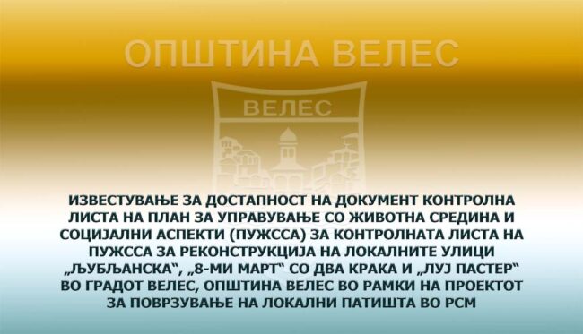 Согласно Законот за заштита на населението од заразни болести, за спроведување на дезинсекција на подрачјето на Општина Велес, како општа мерка за заштита на населението од заразни болести, Општина Велес го издава следното соопштение за јавност Општина Велес ја информира јавноста дека, првото авионско тертирање против комарци ќе го изврши на ден 20 јуни…