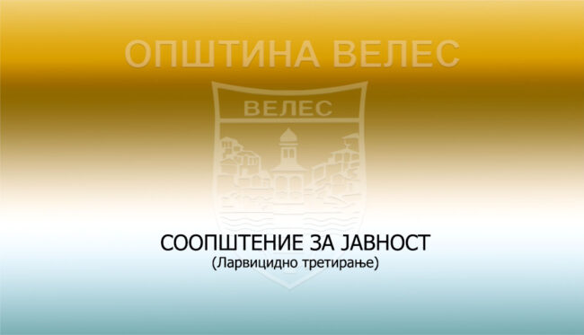 Согласно Законот за заштита на населението од заразни болести, за спроведување на превентивна теристичка дезинсекција на подрачјето на Општина Велес, како општа мерка за заштита на населението од заразни болести, Општина Велес го издава следното соопштение за јавност: Општина Велес ја известува јавноста дека денес започнаа активностите за прво ларвицидно теренско – третирање од земја,…
