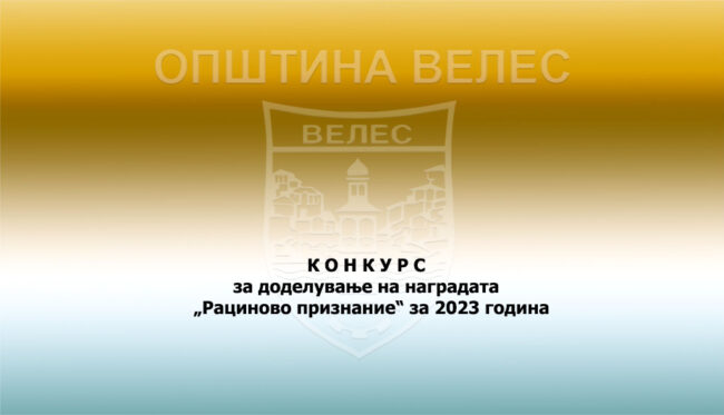 Градоначалникот на Општина Велес врз основа на Предлогот од Организацискиот одбор на културната манифестација „60.Рацинови средби“ за објавување конкурс за доделување на наградата „Рациново признание“ за 2023 бр.08-1177/15 од 03.05.2023 година објавува:     К О Н К У Р С за доделување на наградата   „Рациново признание“ за 2023 година    Наградата „Рациново признание“…