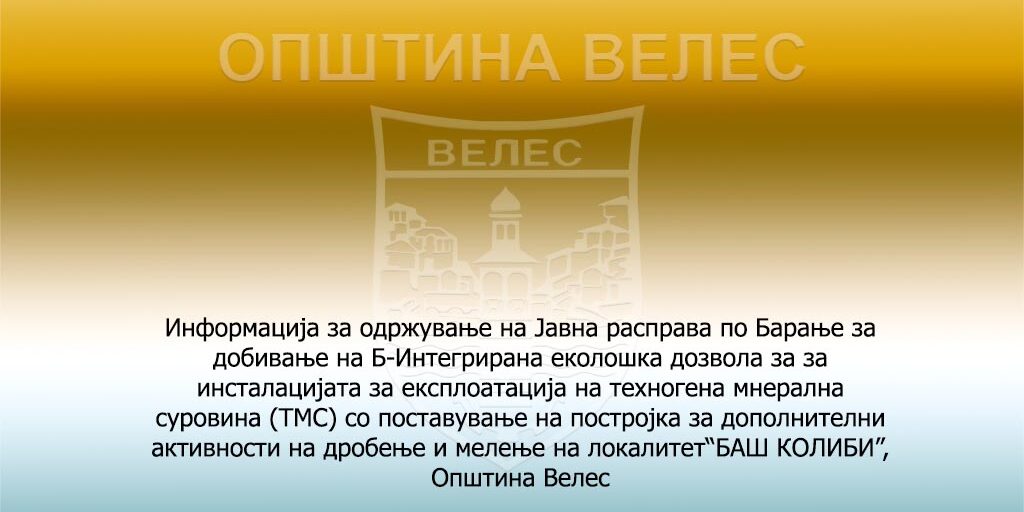 Јавната расправа по барањето за добивање на Б-Интегрирана еколошка дозвола за експлоатација на техногена мнерална суровина (ТМС) со поставување на постројка за дополнителни активности на дробење и мелење на локалитет“БАШ КОЛИБИ”, општина Велес ќе се одржи на 25 декември 2023 год. (понеделник) , во просториите на хотел Глориус , општина Велес со почеток во 13.00 часот.