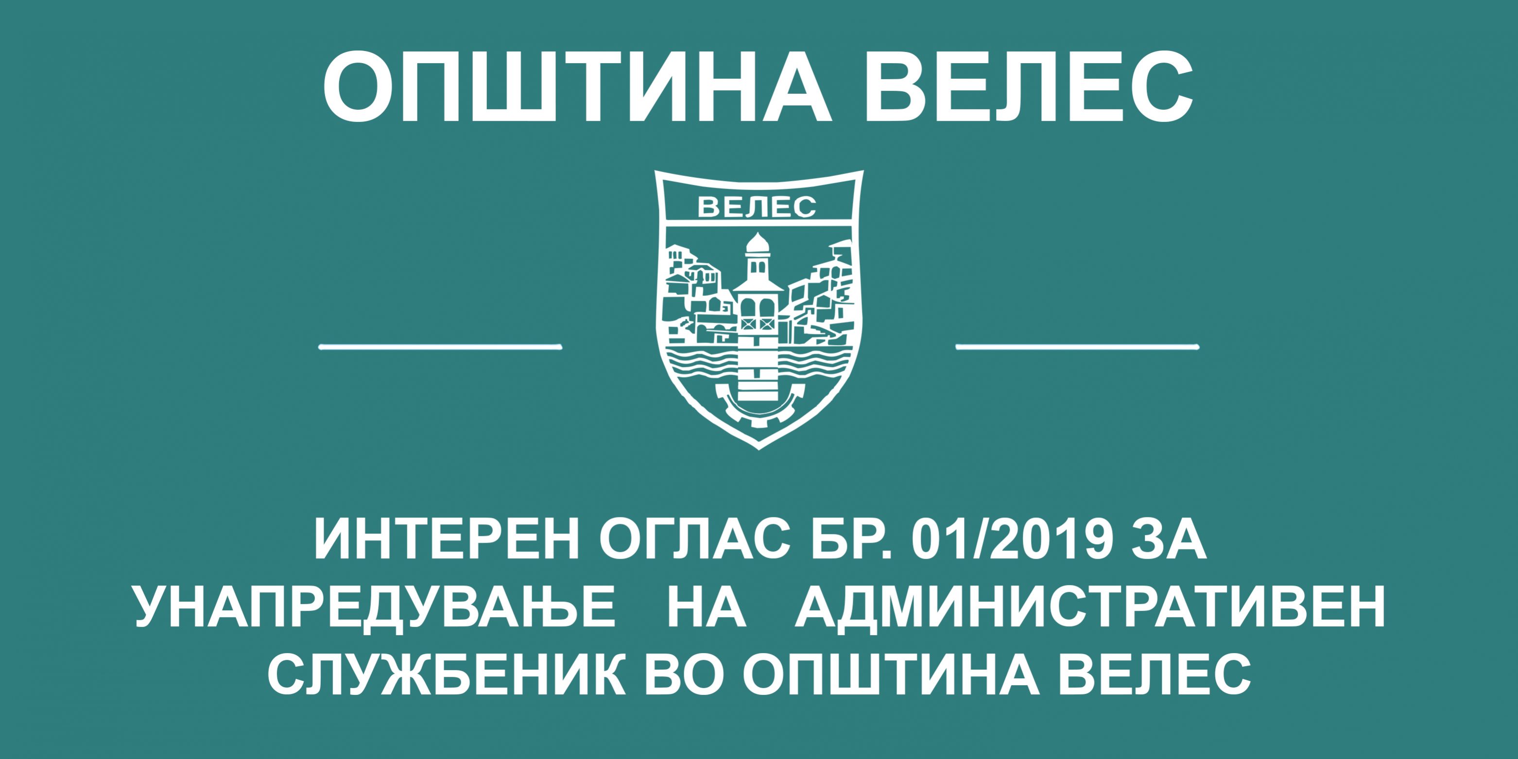 Врз основа на член 30 став 1 алинеја 2 и став 3 и член 48 од Законот за административни службеници („Службен весник на Република Македонија“ бр. 27/14, 199/14, 48/15, 5/16, 142/16 и 11/18), член 2 од Правилникот за формата и содржината на интерниот оглас, начинот на поднесување на пријавата за унапредување, начинот на спроведување на административната селекција и интервјуто, како и начинот на нивно бодирање и максималниот број бодови од постапката за селекција во зависност од категоријата на работно место за кое е објавен интерниот оглас („Службен весник на Република Македонија“ бр.11/15 и 35/18) и одредбите од Правилникот за систематизација на работните места во Општина Велес бр.01-2888/1 од 12.06.2018 година, Општина Велес објавува