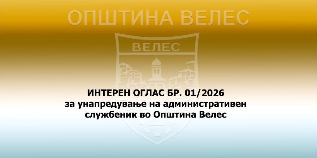 Врз основа на член 30 став 1 алинеја 2 и став 3 и член 48 од Законот за административни службеници („Службен весник на РМ“ бр. 27/14, 199/14, 48/15, 5/16, 142/16 и 11/18 и „Службен весник на РСМ“ бр. 275/19, 14/20 и 215/21), член 2 од Правилникот за формата и содржината на интерниот оглас, начинот на поднесување на пријавата за унапредување, начинот на спроведување на административната селекција и интервјуто, како и начинот на нивно бодирање и максималниот број бодови од постапката за селекција во зависност од категоријата на работно место за кое е објавен интерниот оглас, член 1 од Правилникот за изменување и дополнување („Службен весник на РМ“ бр.11/15 и 35/18) и одредбите од Правилникот за систематизација за работните места на Општина Велес бр.01-2888/1 од 12.06.2018 година и Правилниците за изменување и дополнување на Правилникот за систематизација на работните места во Општина Велес бр.01-2982/1 од 06.08.2021 година, 01-613/1 од 31.01.2021 година, 01-1239/1 од 18.03.2021 година, 01-2196/1 од 27.05.2021 година, 01-2691/1 од 06.09.2021 година и бр.01-1521/1 од 17.03.2022 година, бр.01-3395/1 од 18.07.2022 година, бр.01-1347/3 од 10.03.2023 година, бр.01-4367/1 од 07.11.2024 година и бр.01-1837/1 од 20.03.2025 година, Општина Велес објавува
