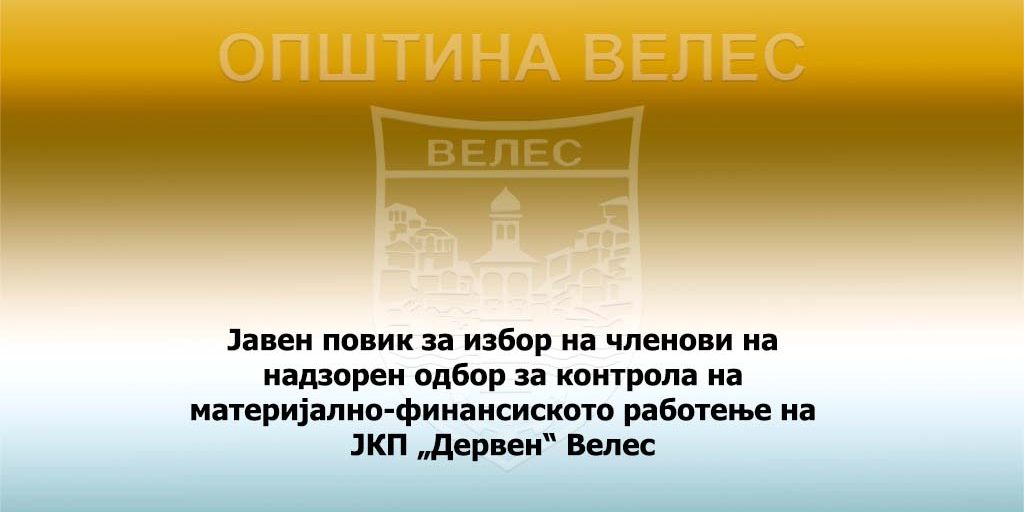 Предмет на Јавниот повик е спроведување на постапка за избор на два члена члена на надзорен одбор за контрола на материјално-финансиското работење на ЈКП „Дервен“ Велес.
