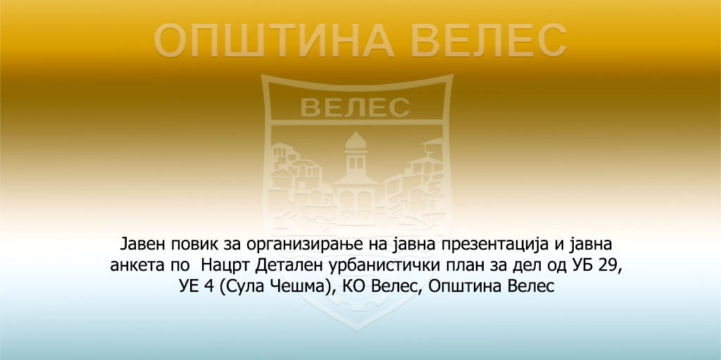Јавен повик за организирање на јавна презентација и јавна анкета по Нацрт Детален урбанистички план за дел од УБ 29, УЕ 4 (Сула Чешма), КО Велес, Општина Велес