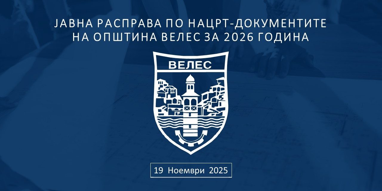 Општина Велес Ве поканува на JАВНA РАСПРАВA ПО НАЦРТ-ДОКУМЕНТИТЕ НА ОПШТИНАТА ЗА 2026 ГОДИНА. Јавната расправa ќе се одржи на 19.11.2025 година (среда) во електронската сала на Општина Велес и тоа за: