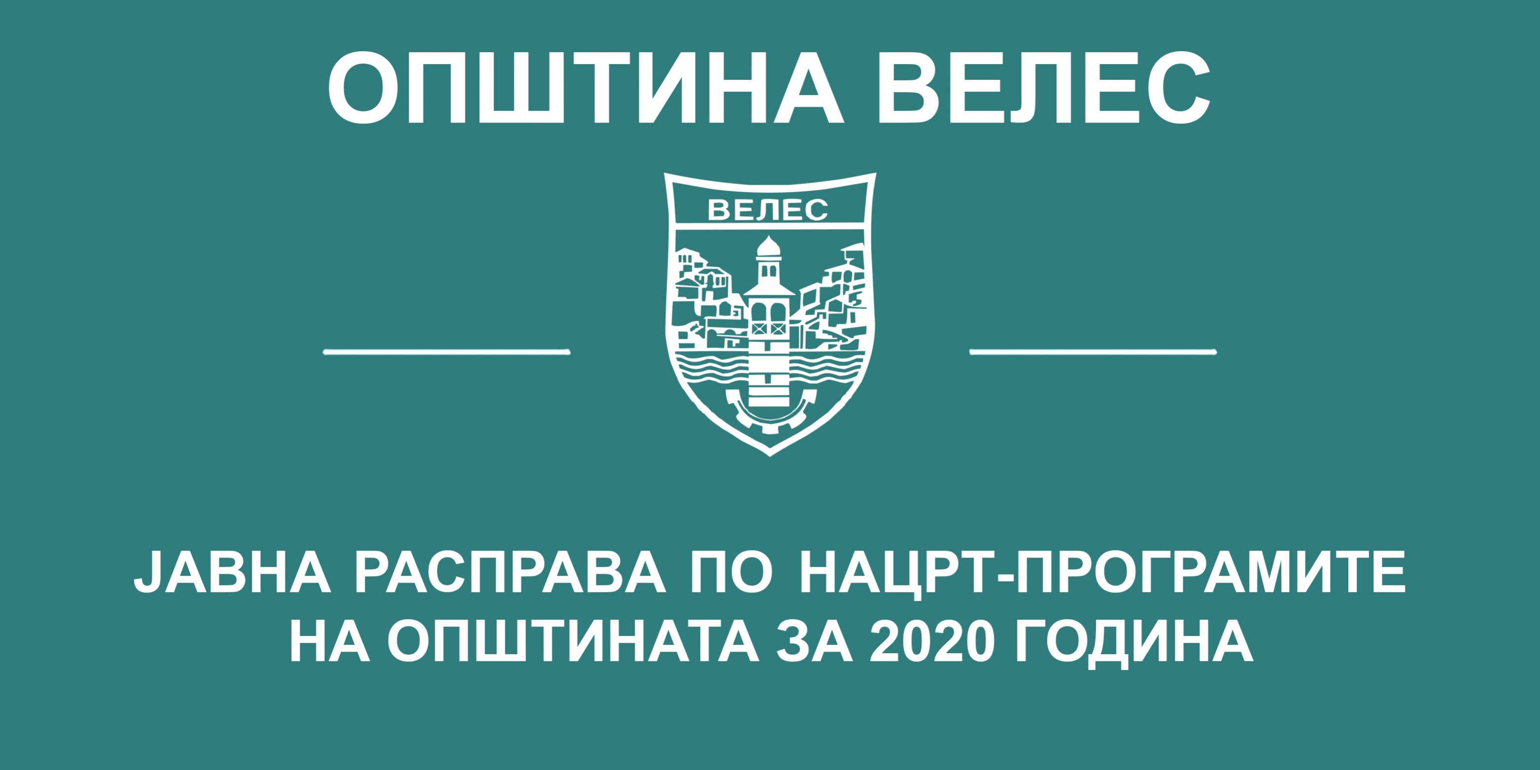 Општина Велес Ве поканува на Jавнa расправa по Нацрт-програмите на општината за 2020 година. Јавната расправa ќе се одржи на  07.11.2019 година (четвртоксо почеток во 16:30 часот во големата сала на Општина Велес и тоа за: