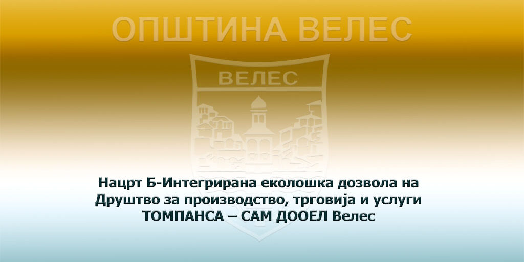 Општина Велес,  изготви Нацрт Б-Интегрирана еколошка дозвола на Друштво за производство, трговија и услуги ТОМПАНСА – САМ ДООЕЛ Велес со седиште на ул.Васил Ѓоргов бр.4 Велес,  за инсталација за интензивно свињарство со капацитет од 180 места за товеници и 30 места за маторици  лоцирана во м.в Тодоровски бавчи на КП 15281 КО Велес, Велес.