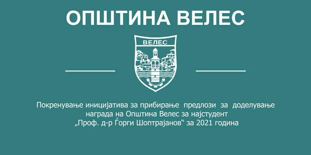 Врз основа на член 127 од Деловникот на Советот на Општина Велес („Сл. гласник на Општина Велес“ бр.12/07), Одлуката за востановување награда на Општина Велес за најстудент „Проф. д-р Ѓорги Шоптрајанов“ („Сл. гласник на Општина Велес“ бр.17/07), Комисијата за општествени дејности покренува иницијатива за прибирање предлози за доделување награда на Општина Велес за најстудент „Проф. д-р Ѓорги Шоптрајанов“ за 2021 година.