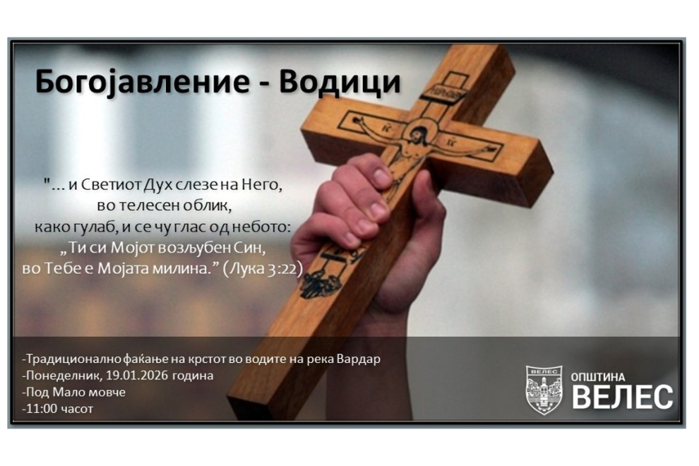 Во пресрет на големиот христијански празник Богојавление Водици, Општина Велес ги повикува сите заинтересирани православни христијани кои сакаат да учествуваат на традиционалното фаќање на светиот крст од водите на река…