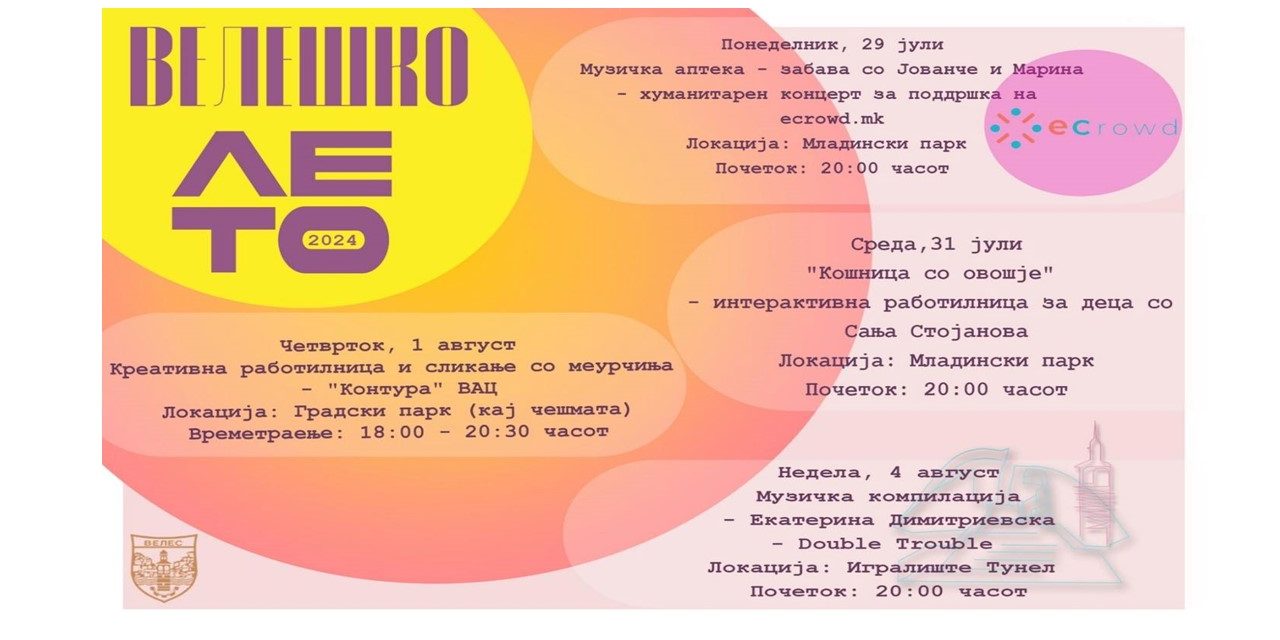 Неделната програма на Велешко лето ќе заврши со музичка компилација на Екатерина Димитриевска – Double Trouble. Музичкиот настан ќе се одржи на Игралиште Тунел во 20:00 часот.