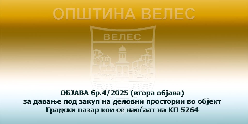 Врз основа на член 2, став 1, точка 4 алинеја 1 и член 4 и член 36 од Законот за користење и располагање со стварите во државна сопственост и со стварите во општинска сопственост („Службен весник на Република Македонија“ бр.78/15,106/15,153/15,190/16,21/18 и „Службен весник на Република Северна Македонија“ бр.101/19, 275/19, 122/21), согласно заведена Одлуката од Совет на Општина Велес за утврдување начин на давање во закуп на деловни простории од објект „Градски пазар“ Велес заведено со број 25-1452/15 од 26.02.2025 година, по пат на електронско јавно наддавање, Комисијата за недвижни и движни ствари сопственост на Општина Велес, објавува закуп на деловен простор во во објект Градски пазар кои се наоѓаат на КП 5264, по пат на електронско јавно наддавање.