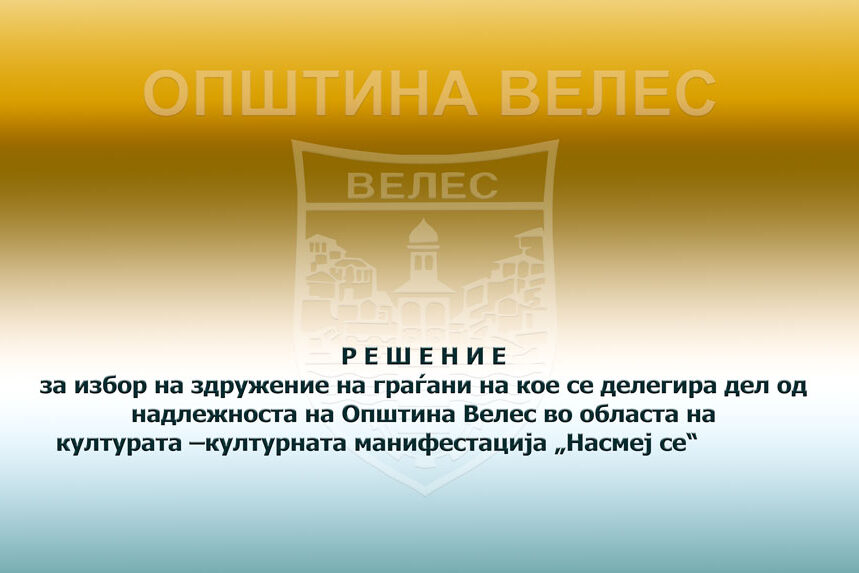 Р Е Ш Е Н И Е за избор на здружение на граѓани на кое се делегира дел од надлежноста на Општина Велес во областа на културата –културната манифестација „Насмеј се“