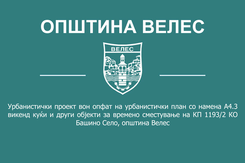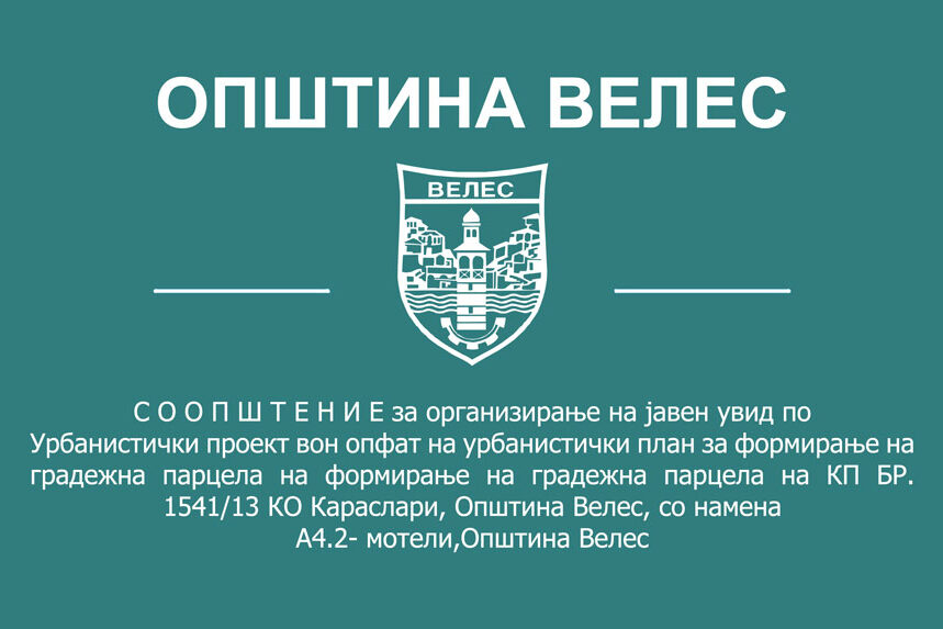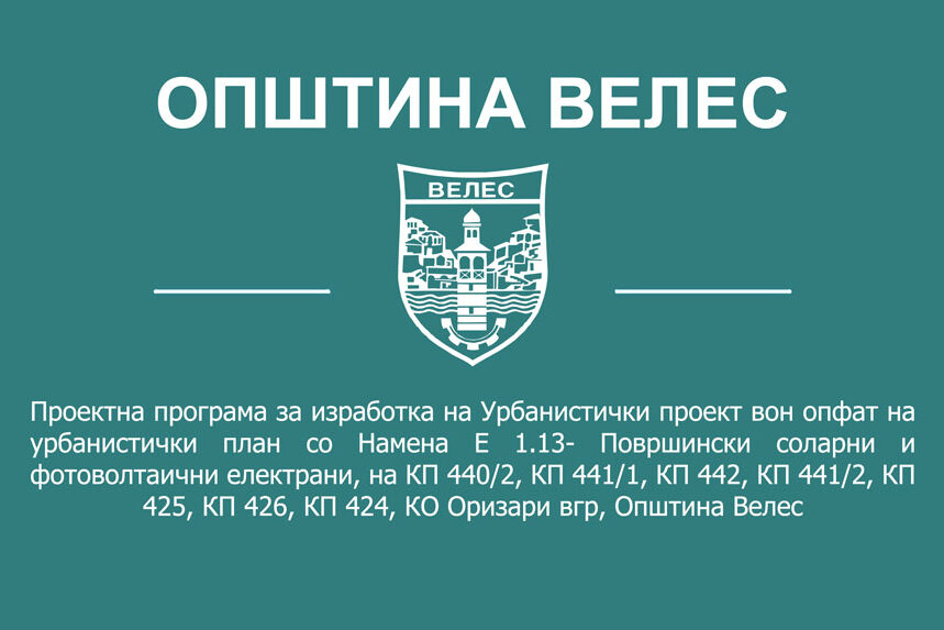 Градоначалникот на Општина Велес, постапувајќи по барањето поднесено под УП број 1310-4 од 17.01.2022 година од страна на Друштво за проектирање, ревизија и надзор ЗУМ ПРОЕКТ ДОО Скопје, за одобрување…