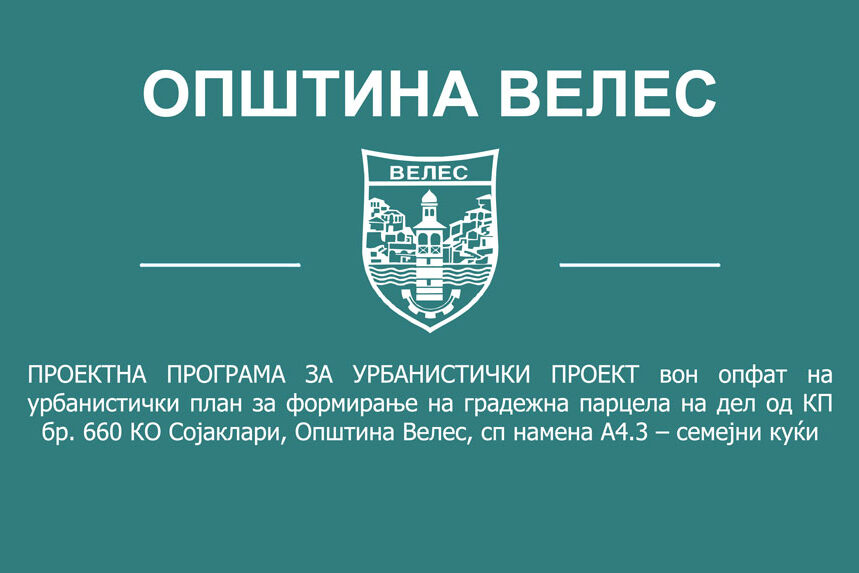 ПРОЕКТНА ПРОГРАМА ЗА УРБАНИСТИЧКИ ПРОЕКТ вон опфат на урбанистички план за формирање на градежна парцела на дел од КП бр. 660 КО Сојаклари, Општина Велес, сп намена А4.3 – семејни…