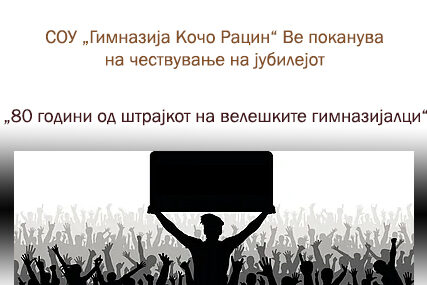 СОУ „Гимназија Кочо Рацин“ Ве поканува на чествување на јубилејот „80 години од штрајкот на велешките гимназијалци“. Настанот е организиран со поддршка на Општина Велес.