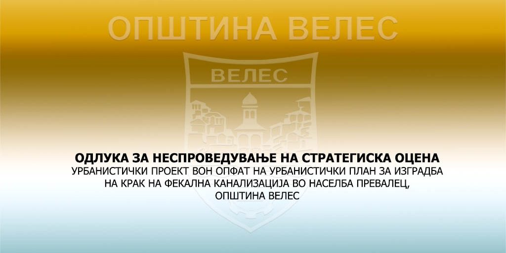 • УРБАНИСТИЧКИ ПРОЕКТ ВОН ОПФАТ НА УРБАНИСТИЧКИ ПЛАН ЗА ИЗГРАДБА НА КРАК НА ФЕКАЛНА КАНАЛИЗАЦИЈА ВО НАСЕЛБА ПРЕВАЛЕЦ, ОПШТИНА ВЕЛЕС
