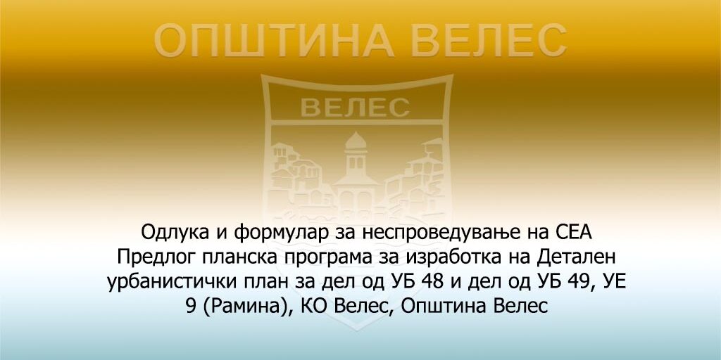 - За планскиот документ Предлог планска програма за изработка на Детален урбанистички план за дел од УБ 48 и дел од УБ 49, УЕ 9 (Рамина), КО Велес, Општина Велес, кој се носи согласно Законот за просторно и урбанистичко планирање (Сл. Весник на РМ бр.199/14, 44/15, 44/15, 193/15, 31/16, 163/16, 64/18 и 168/18), не е потребно да се спроведе стратегиска оцена на влијанието врз животната средина согласно член 65 од Законот за животната средина.