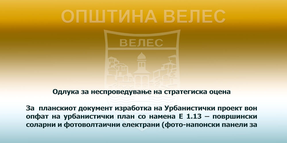 За  планскиот документ изработка на Урбанистички проект вон опфат на урбанистички план со намена Е 1.13 – површински соларни и фотоволтаични електрани (фото-напонски панели за производство на електрична енергија кои се градат на земјиште), на КП 130, КП 131, КП 132, КП 133, КП 124 и дел од КП 73/1, КО Чалошево – Општина Велес.