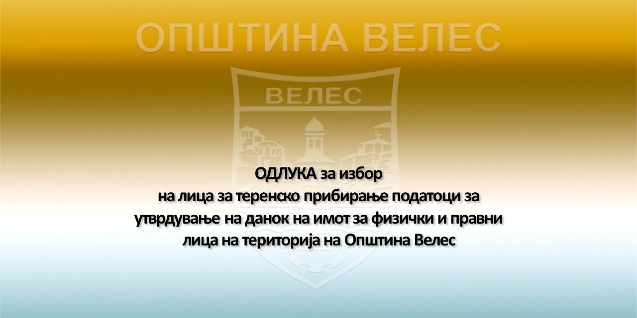 Советот на Општина Велес на 8-та седница одржана на ден 17.02.2026 година донесе Одлука бр.09-1014/10 за утврдување потреба од спроведување проект за ангажирање на лица за теренско прибирање податоци за утврдување на данок на имот за физички и правни лица на територијата на Општина Велес („Службен гласник на Општина Велес“ бр.2/26).