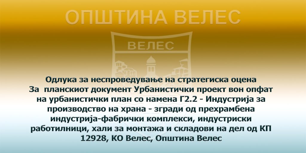 За планскиот документ Урбанистички проект вон опфат на урбанистички план со намена Г2.2 – Индустрија за производство на храна – згради од прехрамбена индустрија-фабрички комплекси, индустриски работилници, хали за монтажа и складови на дел од КП 12928, КО Велес, Општина Велес кој се носи согласно Законот за урбанистичко планирање (Сл.весник на Р.С.Македонија бр. 32/20 и 111/23)