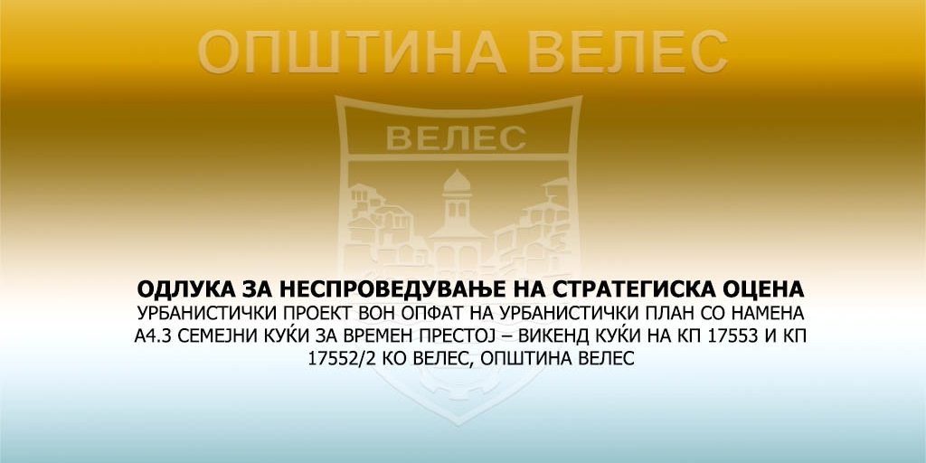 Авг192024 ОДЛУКА ЗА НЕСПРОВЕДУВАЊЕ НА СТРАТЕГИСКА ОЦЕНА УРБАНИСТИЧКИ ПРОЕКТ ВОН ОПФАТ НА УРБАНИСТИЧКИ ПЛАН СО НАМЕНА А4.3 СЕМЕЈНИ КУЌИ ЗА ВРЕМЕН ПРЕСТОЈ – ВИКЕНД КУЌИ НА КП 17553 И КП 17552/2 КО ВЕЛЕС, ОПШТИНА ВЕЛЕС Споделете: Share on FacebookShare on Facebook Share on XShare on X Pin itShare on Pinterest Share on LinkedInShare on LinkedIn